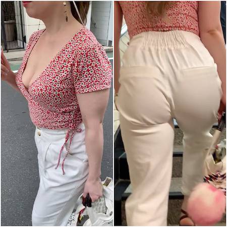 フィット感が抜群でも、こんなに尻肉がこぼれ出ている着衣尻に出会う事はそうそうない。巻き髪ロングヘアーのセレブ美女が履く白レギパン。、